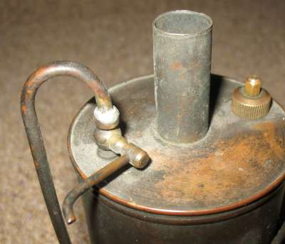 The boiler is brass, 68mm diameter x about 64mm high, with a single flue tube. It is fitted with a safety valve and regulator and a water level try cock at about the mid level. It doesn't have a whistle, although an otherwise similar example I have seen does have one. Maybe it was an option. The burner is missing but I guess it was a meths type. There is no base plate under the firebox and there doesn't appear to be any fixings for one.