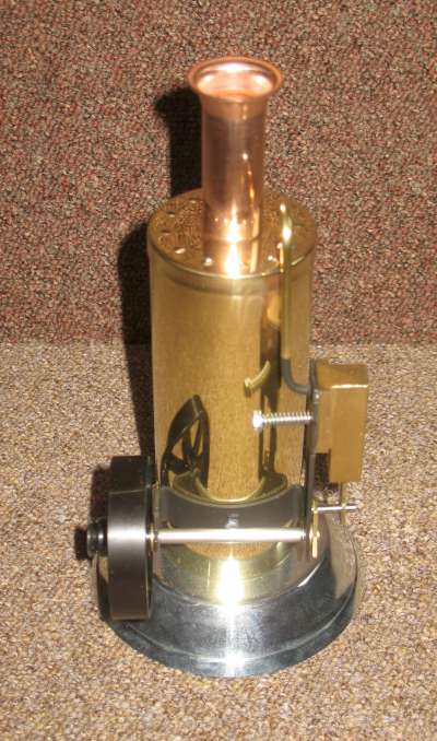 The boiler is 50mm diameter x approx 80mm high, with a single centre flue. It has an overflow type water level indication and a safety valve.