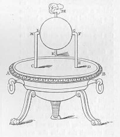 This is a miniature representation of the Aeolipile, described and probably invented by Hero of Alexandria in the 1st century AD (Wikipedia page). There are no contemporary pictures of the original, just a vague description; but it is usually shown as something like the bottom image on the left.