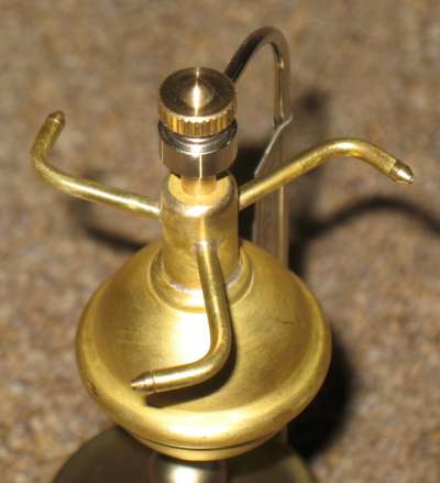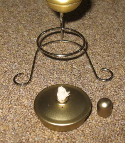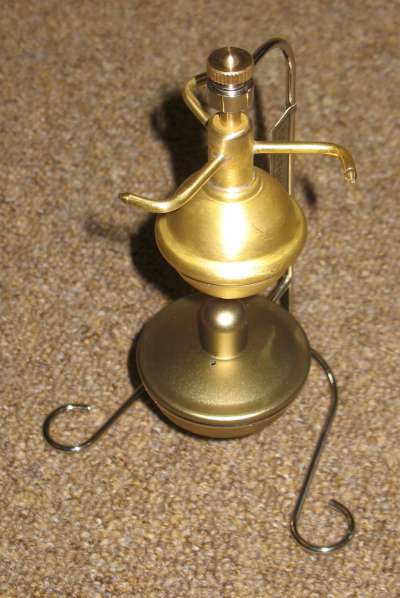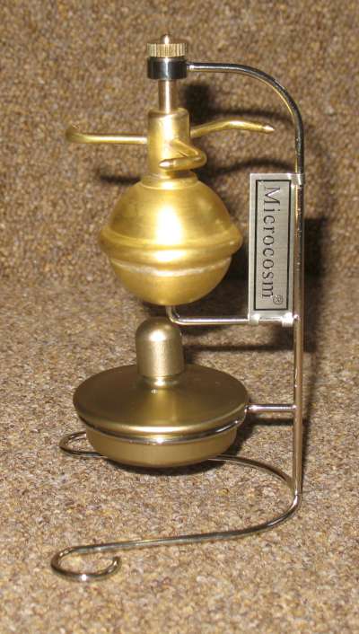 It is a reaction turbine, with no blades but three steam jets exhausting into the atmosphere. The roughly spherical boiler, 40mm diameter spins with the jets and is heated by a meths burner. It is supported by a needle bearing at the bottom and a miniature ball bearing at the top.