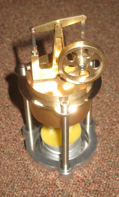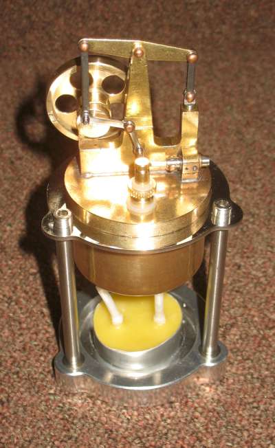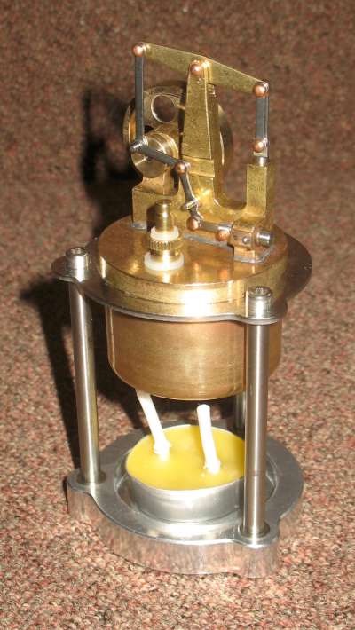 The engine is mounted directly on the top of the boiler, which is supported by a tripod over a candle for heating. The main part of the engine, including the cylinder, valve chest, crankshaft bearing and the support pillar for the beam, is machined from a single block of brass. It is soldered to the top of the boiler, with no pipework.