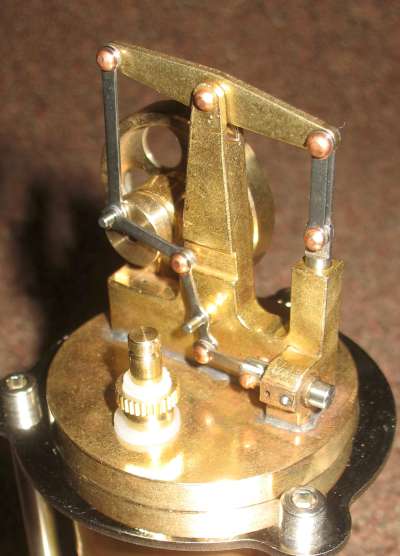 The cylinder is cast into the main engine part; 4mm bore x 7mm stroke. It is controlled by a piston valve connected to the main crank via a linkage. The piston is connected to one end of the beam using a simple connecting rod, with no parallel motion or crosshead. The other end of the beam is connected to a disk crank. The crankshaft has a 34mm diameter machined brass flywheel. The centre of the crankshaft appears to be running in a miniature ball race.