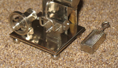 The steam is fed to the port face of a double acting oscillating cylinder; approx 5mm bore x 9mm stroke. The piston rod connects with a disk crank at one end of the crankshaft, at the other end of which there is a 24mm flywheel and a 7.5mm pulley.
