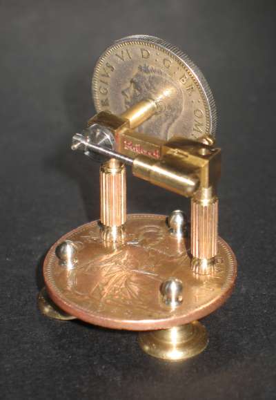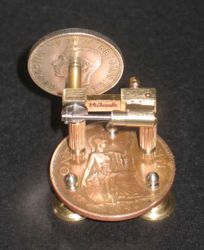 This is a simple engine using an old UK penny for the base. This example was customised by Phil using a shilling for the flywheel, instead of the normal turned brass one. The shilling is dated 1949 (my birth date). The penny is dated 1948. I also have a later version with a built in compressor (see here)