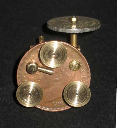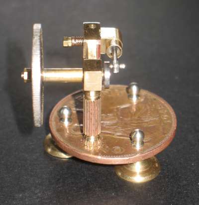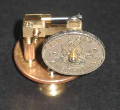It has a tiny single acting oscillating cylinder, 1/8" bore x 1/8" stroke. The engine block is supported on two ornate brass pillars, one of which carries the steam feed. Exhaust is through a hole in the top of the block. The pillars are mounted on a 1948 UK penny, with the steam inlet out of sight underneath. The penny is supported on three brass feet. The crankshaft has a 1949 UK shilling fitted as a flywheel.