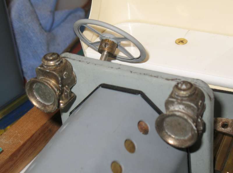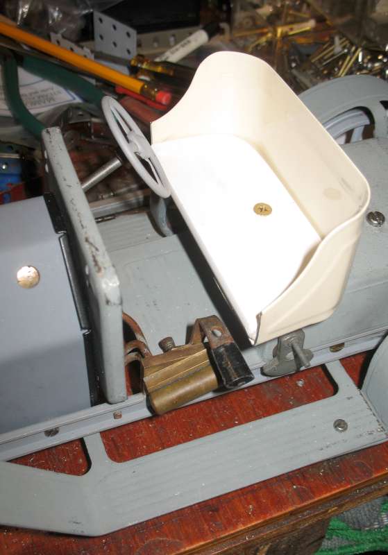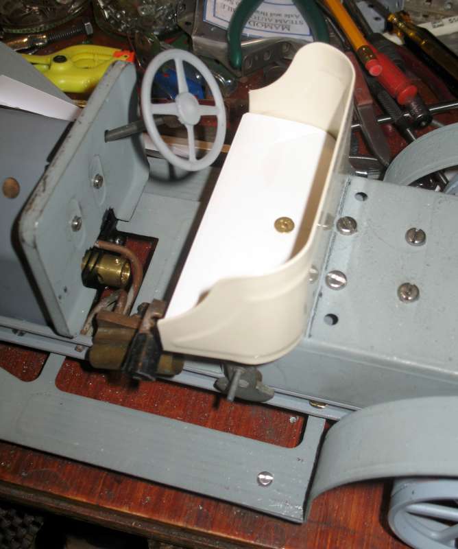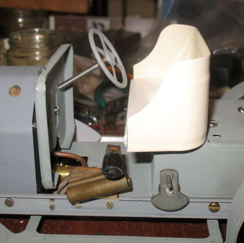 Having moved the rear axle and the seat forward, I now realise that the seat is in the way of the reversing lever. I had to bend the lever at right angles to clear, and I hope this won't cause any problems in running. Instead of the rather sporty leather seat, I'm using a bit of PVC cut from a shelf, which looks more appropriate (or will do when painted). I hope it doesn't get too hot!