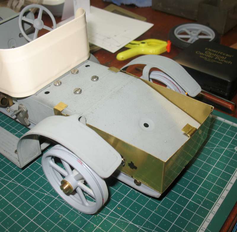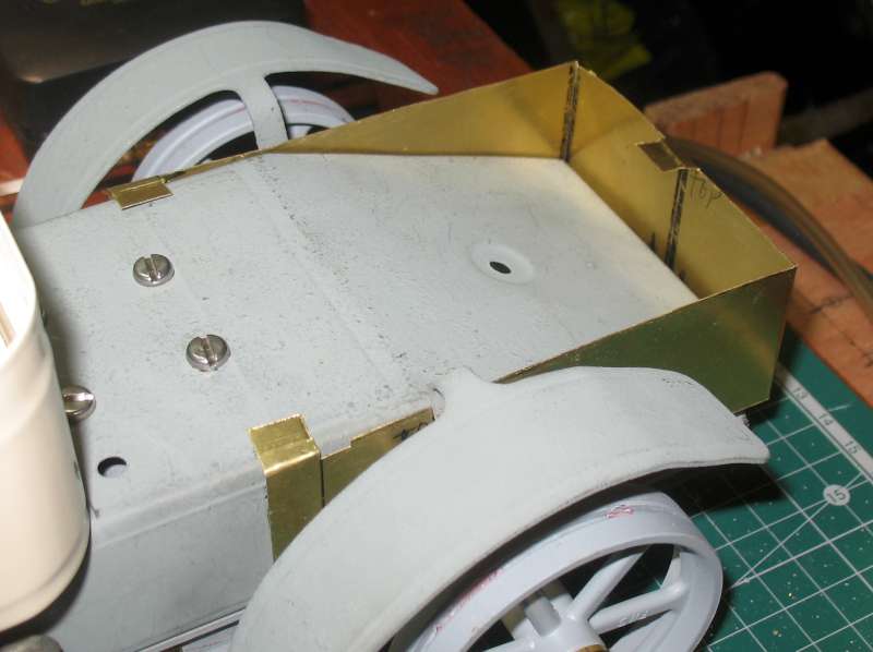 Things are never as simple as they seem at first. Because the wheelbase is now shorter, I've had to shorten the running boards. While I was doing that, to make the mudguards look more utilitarian, I removed the flairs at each end.