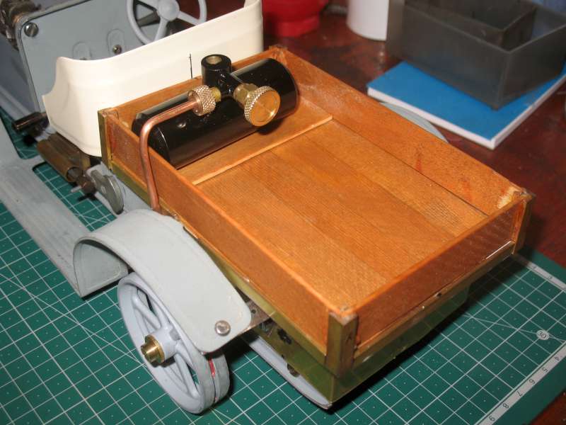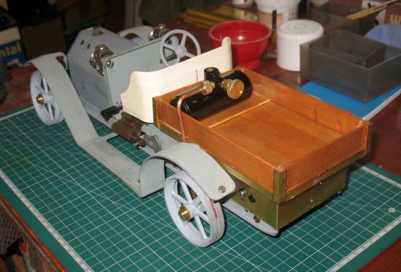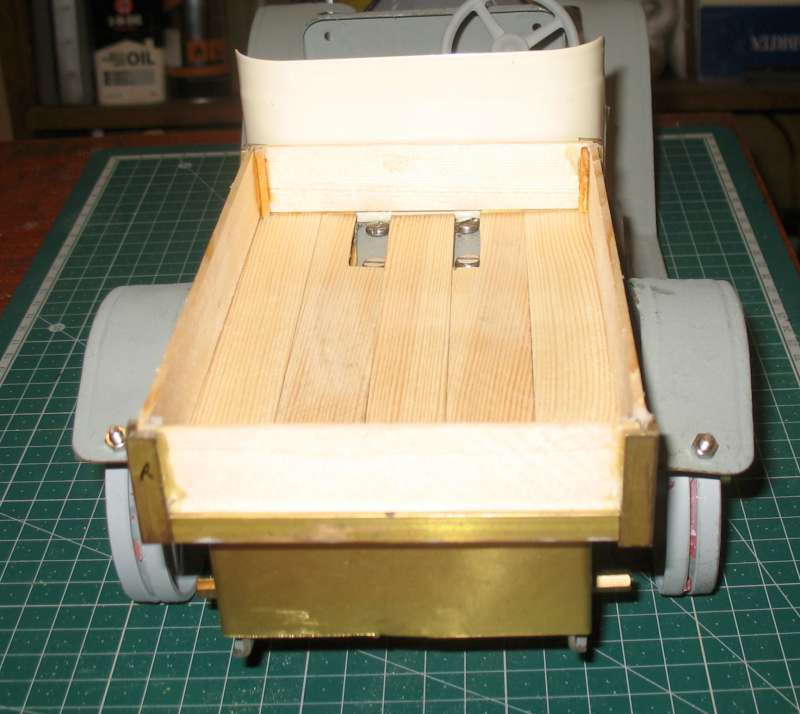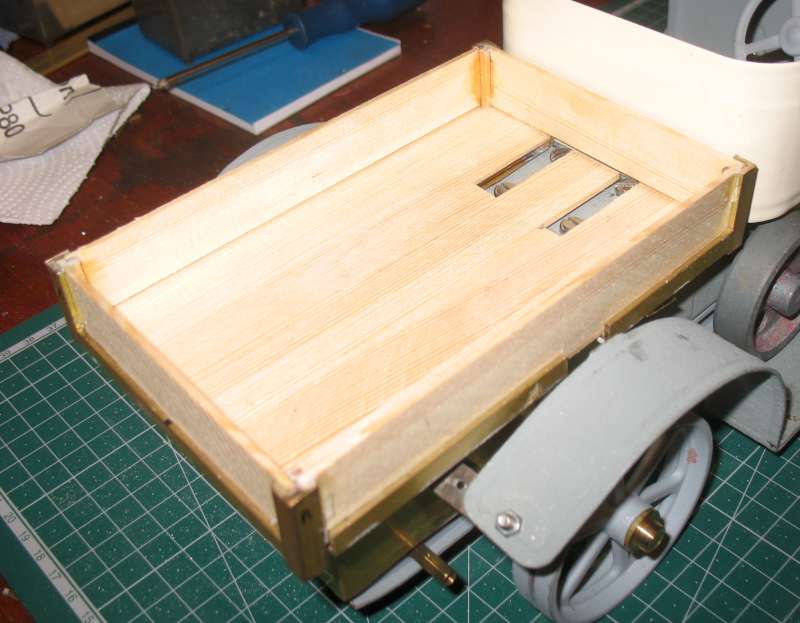 The screws fixing the bed to the chassis are obscured by the sides and ends. I started by cutting access holes in the bed but, again, it looked awful. In the end made it so the vertical part is removable from the horizontal part. This means that the vertical part has to be reasonably rigid on it's own, which required extra stiffening at the corners. There are still gaps in the floor boards to access the screws holding the gearbox. These are needed for final adjustment of the gear meshing, as mentioned earlier. These gaps, hopefully, will be at least partly covered by the gas tank.