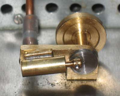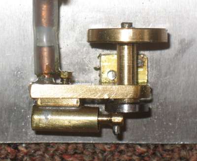 The steam is fed to the port face of a single acting oscillating cylinder; approx 6mm bore x 6mm stroke. The piston rod connects with a disk crank at one end of the crankshaft, at the other end of which there is a 15mm flywheel.