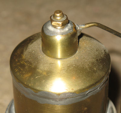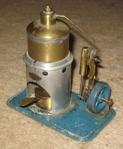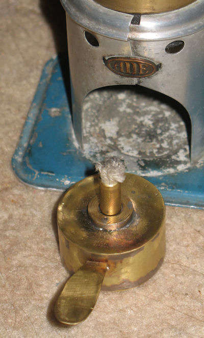The brass boiler is 48mm diameter x approx 60mm high. It sits on an aluminium wrap-around firebox. The front of the firebox is held together with a brass name plate. The burner is a single wick meths type made of brass. On the top of the boiler is a steam dome, which also houses the small safety valve. There is no water level indication or whistle.