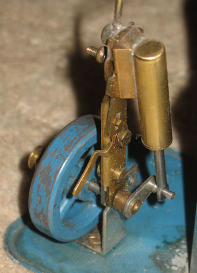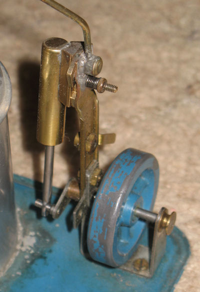 Steam is fed directly from the side of the dome to the engine, without any throttle, lubricator or superheater. The engine is a single acting oscillating cylinder; 7.75mm bore x 17mm stroke. It has an unusual reversing mechanism. It consists of a movable port face sandwiched between the cylinder and the engine frame. This is moved by means of a lever on the frame.