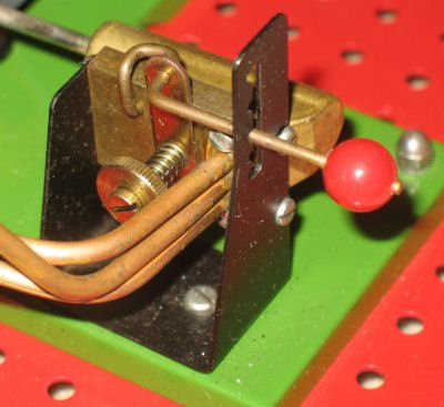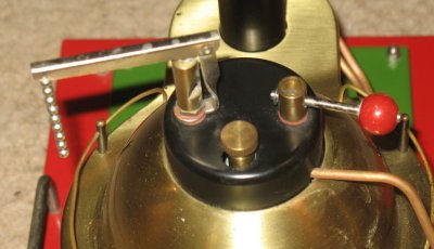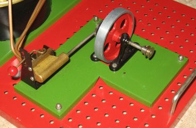 The whole burner & boiler setup is enclosed in a large outer casing, cylindrical in shape with a hemispherical top. An extension to this casing supports the chimney which, unusually for a toy engine, carries away the burner fumes as well as the steam exhaust. The Esbit burner is mounted on a sliding mechanism with an interlock designed to prevent little fingers extracting it or dislodging it accidentally. It also ensures the burner is located in the optimum position under the boiler. It is designed to take a single rectangular Esbit tablet. The boiler itself is a small vertical pot boiler (approx 50mm diameter x 60mm height) with a total capacity of just 100ml; i.e. about 75ml water capacity. On the top are mounted a whistle, weight type safety valve, filler plug and a steam dome (hidden under the cover). The whistle looks like a standard Mamod type but I don't know if it was supplied by Mamod or is a copy. The top half of the boiler is surrounded by heat insulation which reduces heat loss and reduces the finger burning potential of the case. The steam feed is taken from the dome to a single-acting oscillating cylinder, approx 7.5mm diam. x 20mm stroke, mounted on a simple folded metal bracket. It has a reversing lever which engages in a notched slot, giving two forward and two reverse positions. Surprisingly, it seems to run faster in the intermediate positions in each direction. I don't know if this is what was intended. The trunnion bolt spring pressure is adjustable with a nice knurled nut. Two exhaust pipes are fed back to the chimney. The crankshaft and flywheel are mounted separately from the cylinder in a pair of substantial bearing blocks. The shaft is oriented in such a way so that the drive pulley is well clear of the cylinder and the rest of the engine. The whole is mounted on a large base plate with plenty of Meccano compatible holes. The base has two handles making it easy to move about while hot. It has four feet with suckers to prevent "walking" while running. This is not really required for vibration because the engine runs extremely smoothly. It would, however, prevent the base sliding under the tension of a drive band to any external equipment. All parts of the engine, boiler housing, base etc are assembled with nuts and bolts, rather than rivets. This should facilitate repairs and maintenance. Not that it's likely to need much because it's robustly made. Unusually for steam toys (apart from special editions) it has a serial number. This one is 05476.