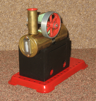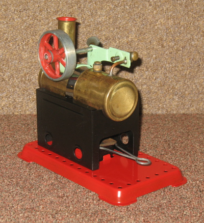 This is the last version of the single cylinder MM2, made for just one year before it was replaced by the SP2. The first version of the MM2 was a twin cylinder horizontally opposed type but few of them were made and are now very rare. The model was reintroduced in 1948 with a single cylinder so that it became similar to the slightly smaller MM1 which was updated about the same time. This design was updated several times, culminating in this version with a raised base, engine frame riveted to the boiler, mazac flywheel, sight glass and solid fuel tablet burner.