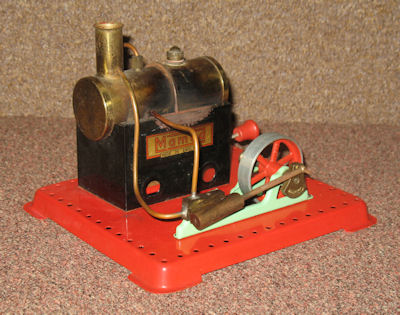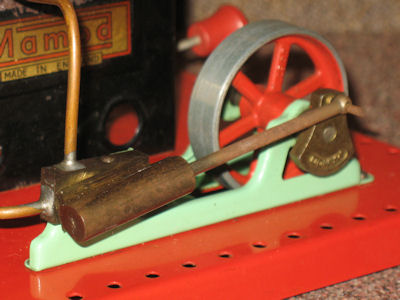 The SE1 was a simpler version of the SE2, without the exhaust throttle and whistle. The boiler is 1 3/4" diam x 4 7/16" long. It has a 3/8" safety valve. The meths burner is the "vapourising" type. The feed pipe goes under the boiler in traditional Mamod fashion (to provide some superheating) and then directly to the cylinder. It has no in-line lubricator or reverser. There is a felt pad built into the port face for lubrication. The single acting oscillating cylinder is 5/16" diam x 3/4" stroke. The exhaust is fed, as usual, to the base of the chimney. The paintwork is in reasonable condition and appears to be original.