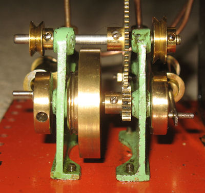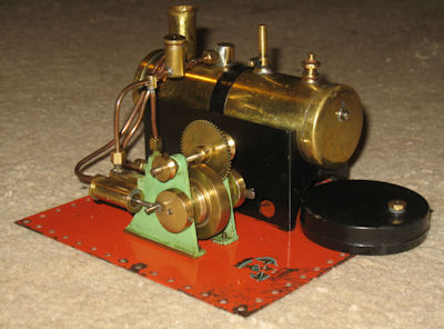 The impressive 4 wick meths burner sits under a low slung boiler; 6" long x 2" diameter. The boiler is fitted with a small overflow plug, 1/4" safety valve, a Bowman style whistle, steam dome and chimney. Steam is fed from the dome via an in-line lubricator and a T joint to the two port faces cast into the cast brass engine frames. The crank shaft has disc cranks at each end and, between the frames, a flywheel with integral pulley and a small gear wheel. The gear wheel meshes with a larger one on a counter shaft mounted above the crankshaft, giving a 3:1 speed reduction. The counter shaft is fitted with a small pulley at each end. The cylinders are of a pseudo-flanged design, 5/16" bore and 3/4" stroke. The pistons have oil grooves turned into them. Exhaust steam is taken through two pipes to the chimney. All pipe joints apart from the T are screw compression fittings. Condition is generally good for the age of the engine. There are signs of resoldering repairs but all parts appear to be original. The paintwork also appears to be original. However, the underside of the base is a darker red than the upper, so this might not be so. There is some surface rust on the base but, considering the rarity of this engine, I will not repaint. Interestingly, there are two decals, the traditional transfer and also a second one, which is stamped or engraved into the base. The burner might not be original because it looks in better condition than the rest. The purchase price is not stated below because the engine was a prize in the 2010 STWWW organised by the Unofficial Mamod and Other Steam Forum.