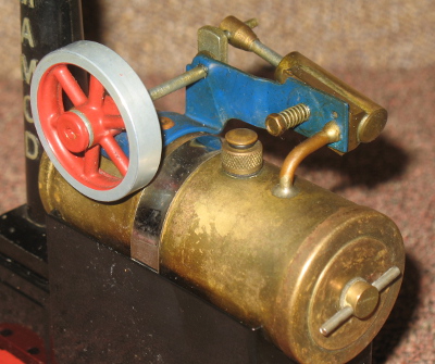 It is an overtype engine with everything mounted on top of the 1 1/2" diam x 3 1/2" boiler, including the 5/16" diam x 1/2" stroke cylinder, 1/4" safety valve and 1 1/2" diam spoked mazac flywheel. There is a water level overflow plug in one end of the boiler. The boiler end cap is too small for the sight glass fitted on most of the SP series. It has a solid fuel tablet burner.