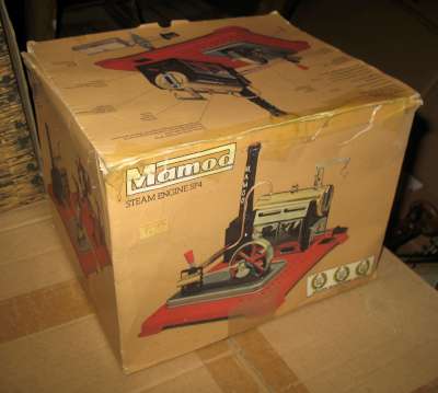 Other than the colour scheme, it's a bog standard SP4. The burner is a standard solid fuel tablet type. The boiler is 1 3/4" dia x 4 1/2" long, with an end cap on one end only, fitted with a water level sight glass. It has the standard 1/4" safety valve. The whistle is of the normal spring lever type. The steam feed has no attempt at superheating and goes directly to the cylinder block. It has no lubricator or throttle. The single acting oscillating cylinder is 8mm dia x 20mm stroke. The crank shaft is fitted with a 64mm diameter flywheel. The exhaust is fed via two pipes, one for each direction of running, to the base of the chimney. As acquired, the engine appeared to be unused and in very good condition. There was no sign of it ever having been fired. (I have fired it up since, however.) It came to me in a box with a £19.75 price label, which also says "NUNN'S DISS 2205 SPORTS & TOYS". The box illustration has the standard colour scheme but that's to be expected. The previous owner says he also had an SP2 in the same colour scheme, in a box with a similar label. My guess is that it's a special edition made for this specific retailer. If anybody can provide some detail of this engine's history, I'd be grateful.