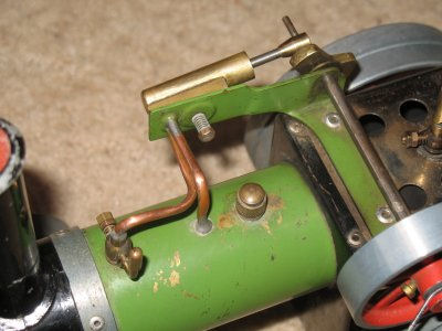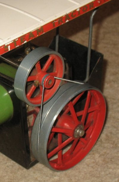It has a small vapourising meths burner, fitted into the "scuttle" so that the rear end of it's handle can act as a towing hook. The burner sits in the traditional Mamod black and chrome firebox at the rear end of the boiler. The green boiler is longer than the similar one on the roller and wagon. The inside dimensions are, however, the same; the extra length being blanked off at the front end. This void is open to the smoke box and this fact is taken advantage of by fitting the throttle (in line with the exhaust pipe) to this front section so that the steam issues up the chimney. A standard 1/4" safety valve and a rotary valve type whistle are also fitted. It has a water level plug in the rear end. Boiler dimensions are 1 3/4" diameter x 6" overall length (4 7/8" long internally). The engine is a single acting oscillating cylinder, with no reverse control. The cylinder is 5/16" diameter x 3/4" stroke. The flywheel drives one of the rear wheels directly through a drive band located in a groove in the outer circumference of the wheel. The front axle is pivoted centrally, with a rod protruding up through the chimney, enabling an extension rod to be fitted for steering. The whole body is covered by a full length cream coloured canopy, attached to wire supports at the rear end and attached to the top edge of the chimney at the front end. General condition is good for it's age. It is all, as far as I can see, original paintwork and fittings. Apart from cleaning off some lime scale and treating the worst of the rust (mostly on the water level plug), I have not done any restoration work on this engine.
