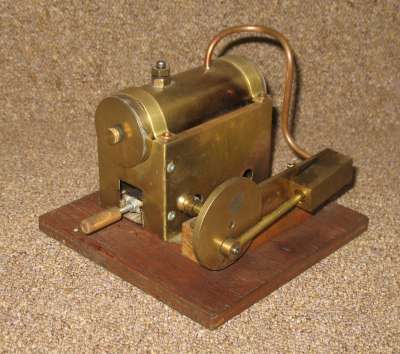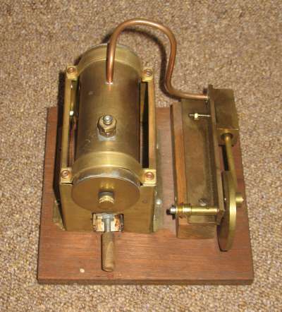 The burner slides onto a bracket located inside the brass firebox / boiler support. The horizontal brass boiler is 40mm diameter x 102mm. It has turned brass plate ends. Originally, it was fitted with a safety valve but no other fittings. I have added a water level plug in one end. The copper steam feed pipe is soldered directly into the top of the boiler and directly to the engine bracket at the other end. There is no throttle or lubricator. The cylinder is square external section, 8mm bore x 24mm stroke. The flywheel is a solid brass disk 50mm diam x 4mm, with the crank pin fixed to it. The other end of the crankshaft has a small pulley.