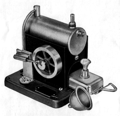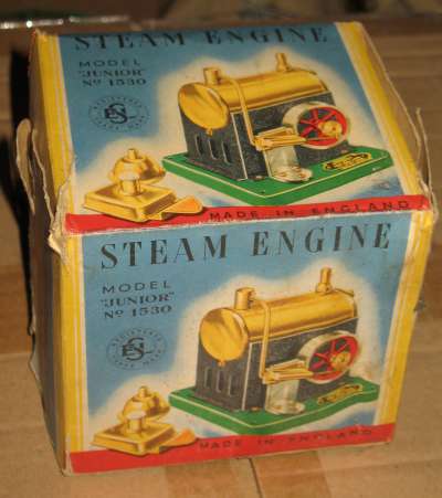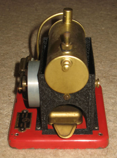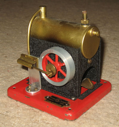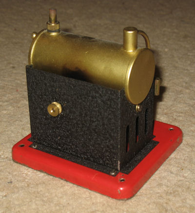 This example has the slightly less common red base. It is a combination of parts from two engines, using the best from each. I have a copy of an original "SEL/Merit" catalogue containing this engine and I quote: "JUNIOR" STEAM ENGINE No. 1530 As befits a traditional British product, all the dimensions are in imperial units - except the boiler capacity, which is in metric! I wonder why. The bottom picture on the left is taken from this catalogue. The Boiler is 3 3/8" long x 1 1/2" diameter. The cylinder is 7/32" bore x 3/8" stroke.
