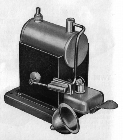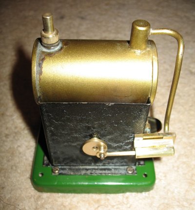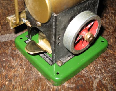 It has a single wick burner under a small boiler, 2 5/8" x 1 1/2" dia, which has the absolute minimum of fittings. It has a filler plug shaped like a dummy safety valve. (At one time, I replaced it with a proper one but I have now restored the dummy one for the sake of originality.) It has no level plug or whistle. The "dome" has a short pipe directly to the cylinder bracket, which is mounted directly on the firebox. The standard SEL cylinder, 1/4" dia x 3/8" stroke, contains the aluminium piston common to most early SEL models. The crankshaft passes through the firebox with a 1 3/4" dia flywheel and pully on the far side. Like all SEL stationary engines, all brasswork was gold painted originally. This tends to flake after a while and it has been removed from the burner, safety valve, cylinder and crank. It still remains on the boiler and steam pipe. The base is the standard early pressed type in green. I have a copy of an original "Merit" catalogue containing this engine and the bottom picture on the left is taken from this catalogue.