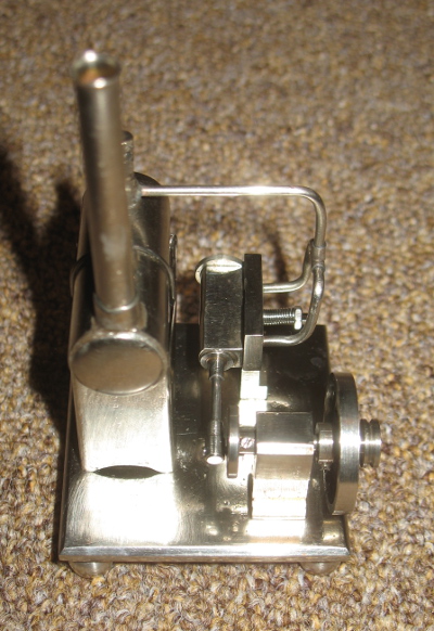 The boiler is a miniscule 16mm diameter x 42mm length and is fired by a vapourising meths burner.It is fitted with a dummy chimney, a safety valve and a steam regulator valve. There is no water level indication.