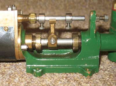 The cylinder is 1/2" bore x approx. 3/4" stroke. It is controlled by a slide valve. The valve rod is fitted with a pair of tappets, which are pushed back and forth by a push rod attached to the piston/pump rod. The pump bore is 1/4", the water flow being controlled by two non-return valves.